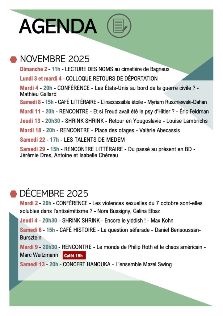 Nos autres évènements : Les mardis du Medem avec Éric Feldman Et si Freud avait été le psy d'Hitler ? (11/11/2025) / Shrink Shrink avec Louise Lambrichs Retour en Yougoslavie (13/11/2025) / Les mardis du Medem avec Valérie Abécassis Place des Otages (18/11/2025) / Scène ouverte aux Talents du Medem (22/11/2025) / Du passé au présent en BD avec J.Dres, A et I.Chéreau (29/11/2025) / Les mardis du Medem avec N.Bussigny et G.Elbaz Les violences sexuelles du 7 octobre sont-elles solubles dans l’antisémitisme ? (02/12/2025) / Shrink Shrink avec Max Kohn Encore le yiddish (04/12/2025) / Café histoire avec D.Bensoussan-Bursztein La question sépharade... (06/12/2025) / Les mardis du Medem avec M.Weitzmann Le monde de Philip Roth et le chaos américain (09/12/2025) / Concert Hanouka avec l'ensemble Mazel Swing (13/12/2025) /