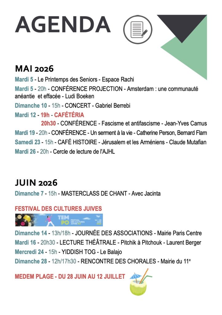 Nos autres évènements : Les rencontres du medem avec Catherine PERSON et Bernard FLAM Un serment à la vie - L’autobiographie de Salomon Buch (19/05/2026) / Café histoire avec Claude MUTAFIAN Jérusalem et les Arméniens (23/05/2026) / Le cercle de lecture de l’AJHL et le Centre Medem présentent Mémoires sans mémoire d'Elise Marienstras (26/05/2026) / Masterclass de chant avec Jacinta (07/06/2026) / Festival des Cultures juives Le tempo des partages (14/06/2026) / Festival des Cultures juives DE PITCHIK À PITCHOUK (16/06/2026) / Festival des Cultures juives Yiddish tog - Le tempo de la joie (24/06/2026) / Medem Plage du 28 juin au 12 juillet Saison 2 des ateliers d'été (28/06/2026) / Festival des Cultures Juives "Vi(e)brato" - Rencontre des chorales (28/06/2026) /