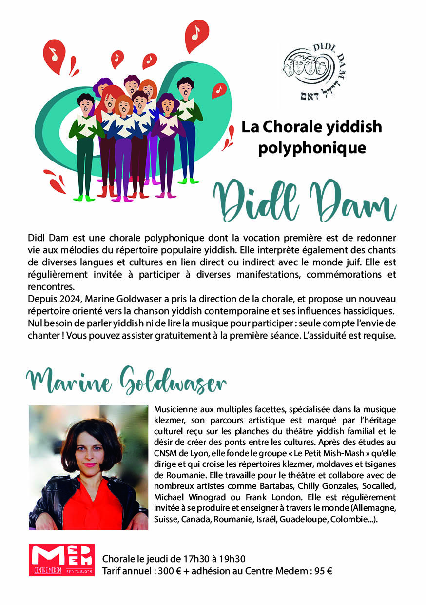 Chorale yiddish polyphonique Didl Dam La chorale Didl Dam au Centre Medem tous les jeudis de 17h30 à 19h30 Cheffe de choeur : Marine Goldwaser En raison du mouvement social du jeudi 18 septembre 2025 la reprise de la chorale est reportée au 25 septembre La Chorale yiddish polyphonique DIDL DAM à la journée des chorales du Festival des Cultures Juives – 2024 Tumbalalaïka – Video (cliquez sur l’image) Tarif annuel : 300 € et adhésion au Centre Medem : 95 €